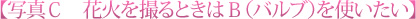 カメラをオートのままで撮影したところ、写真Cのような写真になってしまいました。花火が打ち上がって完全に開く前にシャッターが閉じてしまったためです。