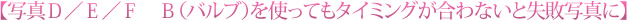 先に説明したように、B(バルブ)はシャッターを押している間ずっとシャッターが開いている機能ですが、それでもタイミングが合わないと失敗写真に繋がります。