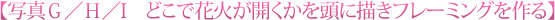 まず、写真Gは思っていた以上に花火が大きかった例です。自分が思っていた以上のサイズだったために、フレーミングからあふれ出てしまいました。