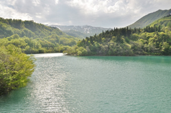 トンネルを抜けると、右手に突如、ダム湖が現れた。