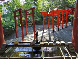鳥居を過ぎて手水舎で清めて進むと右手に御神水があります。大楠が佇む鎮守の森は、美しい水の場所でもあるのです。