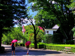 展示建造物を巡るために用意された日傘にもなる赤い傘が雑木林の中の散策路に目立つ。うれしそうに傘をさして歩き始めたフランスから来たふたりの女性は、「日本の勉強になるから来ました。ネットの口コミ情報で調べたのです」という。どうやら、外国人観光客用のサイトでも人気があるらしい。
