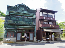 ビジターセンター(ここに受付がある。この建物もまた移築されたもので、昭和15年に皇居前広場で開催された紀元2600年記念式典のために仮設された式殿だ)の前のセンターゾーンには明治から昭和の政治を担った高橋是清の邸宅や港区白金にあった旧宇和島藩伊達家の門などがある。