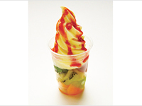 ブドウ、梨、桃…。日本有数のフルーツ名産地だけに季節のフルーツを使用したプレミアムソフトが人気です。フルーツ、ソフト、フルーツソースの3段重ねで!