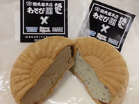 大人の味は七味だけではありません。静岡名産のわさびも同様です。控えめのわさびとチョコ、小豆を合わせて珍しいもなかができました。ここだけのオリジナル商品です。