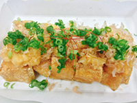 福井県は油揚げの消費量日本一。油揚げや厚揚げを利用したグルメが数多くあります。あげのやいたんは、まさに厚揚げの焼いたの。カリッと焼いた皮がおいしいんです!