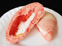 岡山は桃太郎伝説もあるくらいで、絶対的な名物が桃です。桃の果肉とクリームがたっぷり入っており、ほんのりの酸味と甘さが絶妙。ピンク色のかわいいパンです。