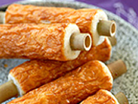 源義経軍が源平合戦に際して用意した食料が竹ちくわ。阿波の近海で獲れた魚をすりつぶし、竹に巻いて焼いたのがその始まり。素朴でおいしい名物グルメです。