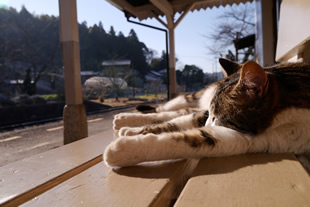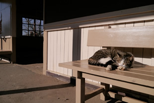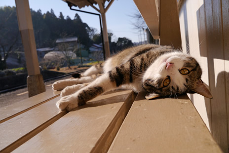とあるローカル線の駅のベンチで寝ている猫を狙ってみました。