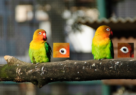 一見、同じように写っている2羽のボタンインコ。目の部分を拡大してみると、左の1羽は目にキャッチライトが入り生き生きしているのに対し、右の1羽にはキャッチライトが入っていないため、少し暗い印象です。