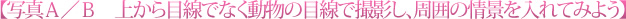 周囲の情景を取り込むためには、動物の正面だけを狙ったのではいけません。正面からだけではなく、いろいろな角度にまわり込んで、周囲の状況を写真に盛り込みましょう。