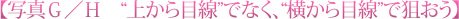 写真Gは立ったままの高さから、写真Hは少しかがんだ状態から水平方向に撮影したカットです。撮影する高さを変えただけでも背景の奥行き感がまったく異なり、写真Hのほうが立体的に仕上がりました。