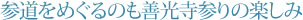 参拝者におもしろいのは山門から仁王門、そしてその下へと続く石畳の参道です。長野駅方面から来ると、山門までの沿道は実に盛況です。