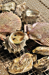 殻付き牡蠣は1㎏900円。ホタテのように見えるヒオウギ貝(大)420円とサザエ(中)310円なども楽しめる