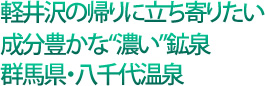軽井沢から上信越自動車道・下仁田ICへの抜け道に、炭酸泉や食塩泉など数種の効能が期待できる濃度の高い温泉がある。穴場的な入浴施設だが、地元客や別荘族からの人気が高く、料理も安くておいしいと評判だ。