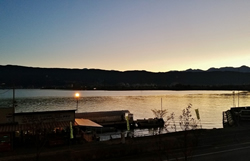 早朝の諏訪湖を民宿の窓より望む