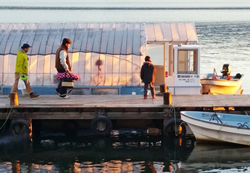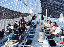 出船は7時半。ぼくらも列の横のテーブルで朝食をすませ、乗船の用意をして船へと向かう。船といってもそこはドーム船。まるで畑の中のビニールハウスのような風貌だ。