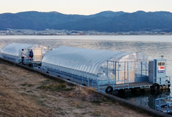 浮かぶビニールハウスの様相のドーム船