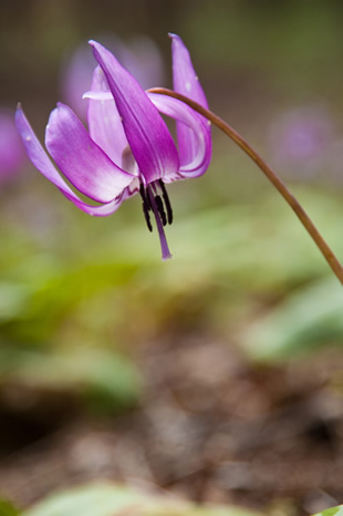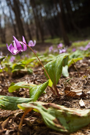 写真Bはカタクリの周囲の雑木林や咲いている斜面を取り入れることで、早春の山に可憐に咲いていた雰囲気を盛り込んでいます。