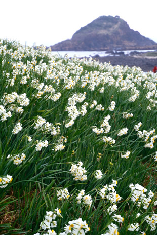 そこでこの地の特徴的な海と岩礁がある方向を狙うと、今度はほかのお客さんが入ってしまいました。そのためにカメラを構える位置を少しずらし、スイセンの反対側に人が隠れるようにしたのが写真Dになります。