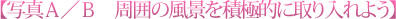 花畑の写真で、花をきれいに見せようとややアップ目にして背景をぼかして…というもの(写真A)をよく見かけます。確かに花はきれいに写っていますが、これでは図鑑で見る写真となんら変わりありません。