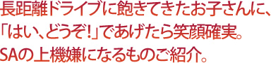 SAにはレストランやフードコート、屋台などが揃っていて、そこで売られているものは多種におよびます。長距離ドライブに飽き気味のお子さんに、「はい、どうぞ!」とSAであげればニコリと笑顔確実のご機嫌回復グルメやグッズ。この作戦、彼女や奥さまにも通じるかも!?ですね。