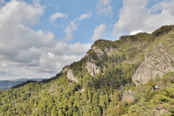 駐車場から東照宮へと向かう道路から。右側の絶壁、鏡岩の下に鳳来寺が見える