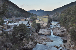 湯谷温泉全景。駐車場から宇連川の馬背岩入口を入ると絶景スポットがある
