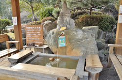 足湯には利修仙人の像があり、一番新しい7号源泉もこの近くにあると地元の方に聞いた。温泉は自治体が一括管理し、泉温が低いため、加熱して各宿に配湯している。
