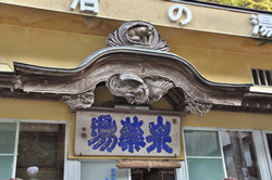 この故事ゆえか、「泉薬湯」入口の唐破風(からはふ)には、狸の像がちょこんと乗っている。