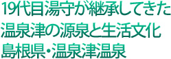 <石州温泉郷湯津の温泉の出泉は何の時代の何年か、明らかにすることは出来ないが、平安時代すでに温泉の所在が平安の都に知れていた。聞き伝えに謂う。往古の何時ごろからか、この浦浜の奥に、杉の樹木に覆われた守山があり、頂きにはひと際高い、古い大杉の木があり、その下に小さな古廟があった。山の谷の巌間には、出泉で出来た小さな池のような泉溜があった。ある時、浦の浜に一人の旅の僧現れた。旅の僧はこの古廟に一夜の睡美枕を求めた。翌朝、旅の僧が古廟を後に山を下って行くと、傷を負った大きな古狸が池に浸って傷口を舐めていた。旅の僧は杉の木立に身を隠し息を凝らして、じっと古狸の様子を見守った。古狸はやがて森の中へ消えていった。旅の僧は古狸が入っていた池に行き、手を入れて見ると温かい温湯だった。旅の僧は浦に出て傷を負った古狸の話を残して去っていった。泉底から湧出する温湯は、病苦を取り除く霊泉として諸人の知るところとなった。>