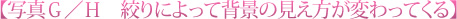 「絞りF3.2」で撮影した写真Gは背景が完全にぼけていますが、写真Hは背景がややシャープになり、背景の様子が見て取れます。