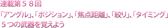 今回紹介した「アングル」、「ポジション」、「焦点距離」、「絞り」、「タイミング」、この5つを変えてあげるだけで、同じものを撮っていても写真の雰囲気は異なります。
