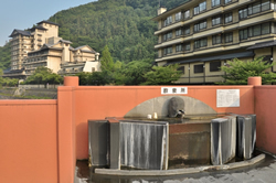 葉月橋通りにある「葉月橋通り飲泉所」には、隣に「あんべ湯」という足湯もあった。「あんべ」というのは塩梅(あんばい)という言葉とアベニュー(並木道)を掛けたもの。こちらは温泉街のそぞろ歩きの休憩所にぴったり。
