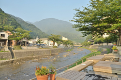 川を渡り、「たちばなや」脇の川沿いには、「もっけ湯」という大きな足湯のウッドデッキがあった。