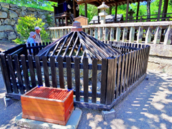 「真田丸」でファンになった人々が訪ねるのでしょう。生花が供えられ、お墓を囲む石段の上には5円や10円が、真田氏の紋である「六文銭」型に置かれていました。