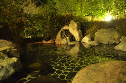 「時わすれ開華亭」開華の湯の露天風呂。このほかサウナ、ジャクジーやレインボー風呂など趣向を凝らした浴槽がある