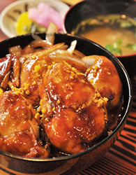 かんざんじ温泉街にある「松の家」の牡蠣カバ丼1620円。甘辛だれは牡蠣にも合う!