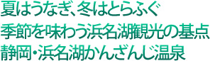 かんざんじ温泉は浜名湖周辺観光の基点。温泉以外にもうなぎ、天然とらふぐ、大ぶりな牡蠣など、季節によって堪能できるご当地自慢の味がもうひとつの大きな魅力だ。