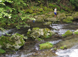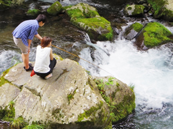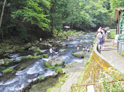 滝壺に続く階段を下りていくと、次第に予期せぬ歓声が響いてくる。それは、滝壺から流れる清流に設置された釣り場からだった。