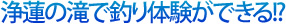 浄蓮の滝から続く清流を利用した常設釣り場で、ニジマスや“清流の女王”と呼ばれる天女魚(アマゴ)を放流。入漁料金は30分、1時間、2時間、1日となっているので、滝見たさに立ち寄った観光客でも気軽に釣り体験ができるのだ。