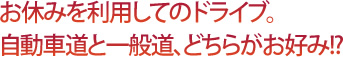 これからのドライブシーズン。みなさんは自動車道派でしょうか。それとも一般道派でしょうか。いずれにせよ、自動車道の施設や道の駅を有効利用してドライブを楽しんでください。