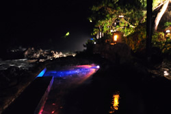 海に面した100mプールの中央には貸切露天「波の湯」があり、竜宮城のようなイメージが漂っている。