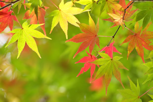 写真Cは、赤、黄、緑のグラデーションが美しい葉を、背景の緑の中に浮かび上がるように狙っています。形もスッキリして色合いも美しく、写真Bと比較すれば、一段とモミジが「キレイ!」に見えると思います。