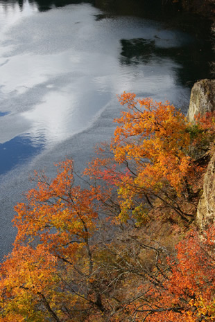写真Eは日の当たった川岸の紅葉が、青空を映して波立つ川面に映え、輝いて見えます。