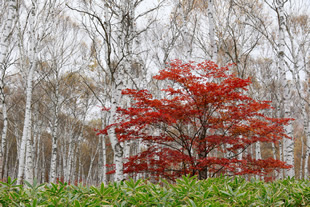 写真Hは1本の赤いカエデの「形」とそれを際立たせる白樺とクマザサの「色」の組み合わせを考えました。