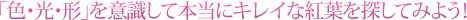 紅葉をキレイに撮るコツは、「色合い(色の組み合わせやグラデーション)が美しく」、そして、「シンプルで形がキレイ」なところを探すことです。