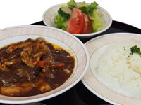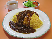 甲府、塩尻といえば日本を代表するワインの産地です。双葉SAはどちらにも近いので、ワインを使ったメニューがたくさんあります。ワイン用に搾ったブドウのかすを飼料に育った甲州ワインビーフを使ったワインビーフシチューも絶品。こちらは同様にブドウの搾りかすに豆腐のおから、マリーゴールドを混ぜた飼料で育てた鶏による「ワイン卵」を使ったハッシュドオムライスです。スープとサラダが付いて、完全なるご馳走になっています。