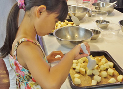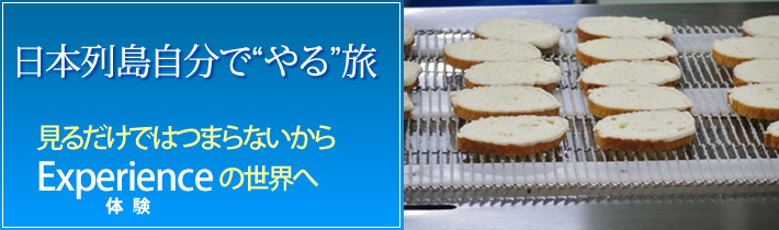 この工場に手作り体験コーナーがある。小さく刻まれたパンに溶かしたバターをかけてかき混ぜ、グラニュー糖をかける。それを鉄板の上にくっつかないように並べ、20分ほどオーブンで焼けばお手製ラスクのできあがりだ。