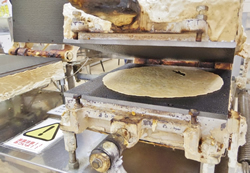 大きな焼き器で大判せんべいを作る